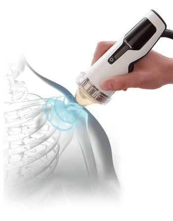 In the body, these high energy acoustic waves stimulate the cells and the body’s intrinsic healing mechanism. In Extracorporeal Focused Shock Wave Therapy, the wave is focused through a lens and transmitted into the body, up to a depth of about 4.7”. You may have heard of high energy Focused Shock Wave (F-SW) devices that can destroy tissues like kidney stones. The F-SW used in physical therapy offer low and medium energy F-SW that are not capable of destroying any tissue but are helpful in pain therapy treatments.